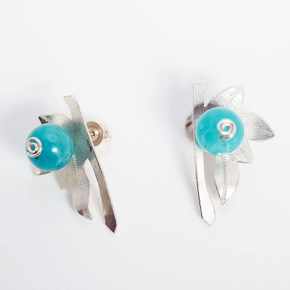 Kõrvaehted on valmistatud hõbedast ja inspireerituna loodusest, kaunistavad neid rohekas-sinise tooniga kaunid amazoniidi ehtekivid. Ehe saabub ehtekarbis.
